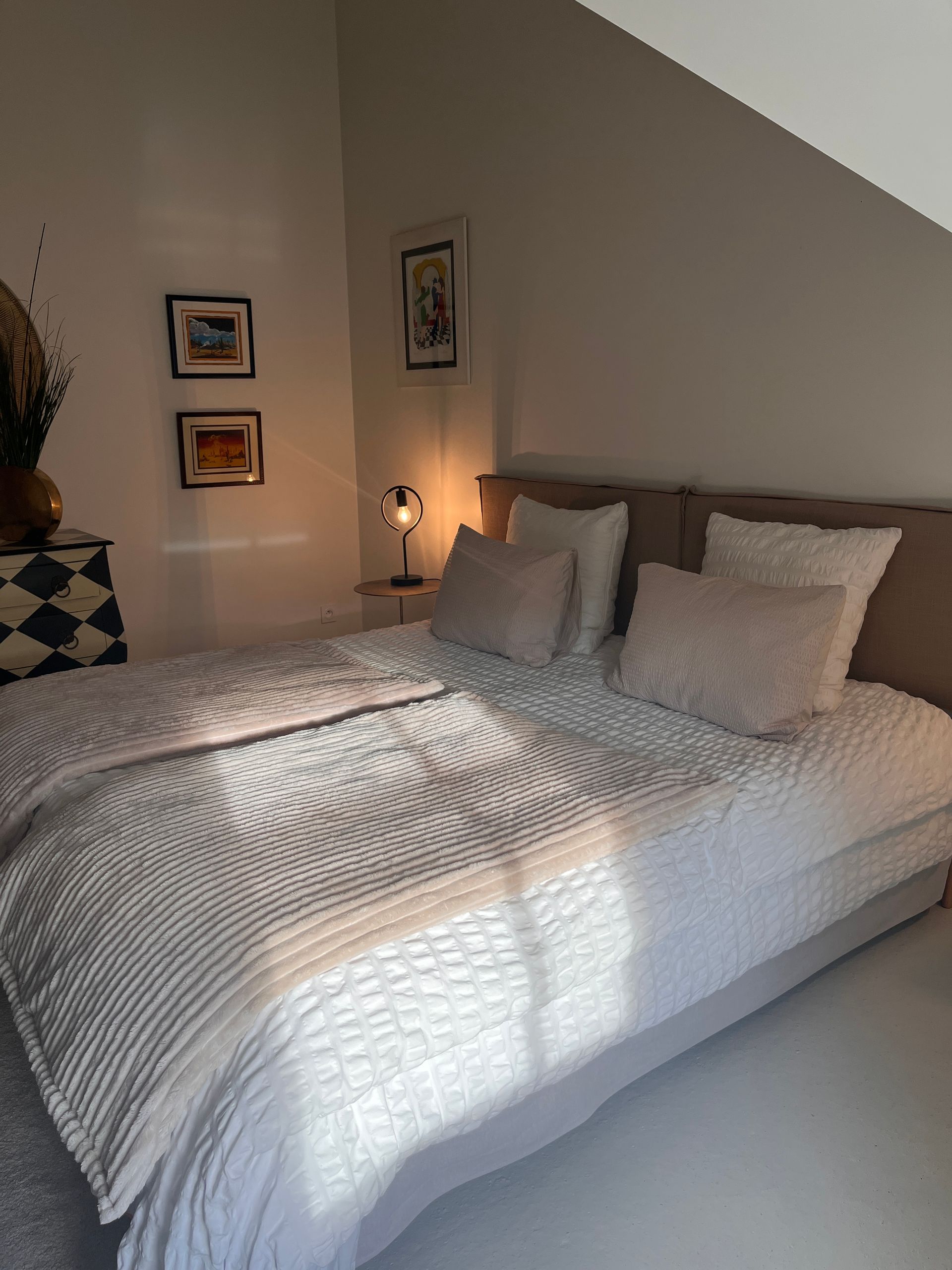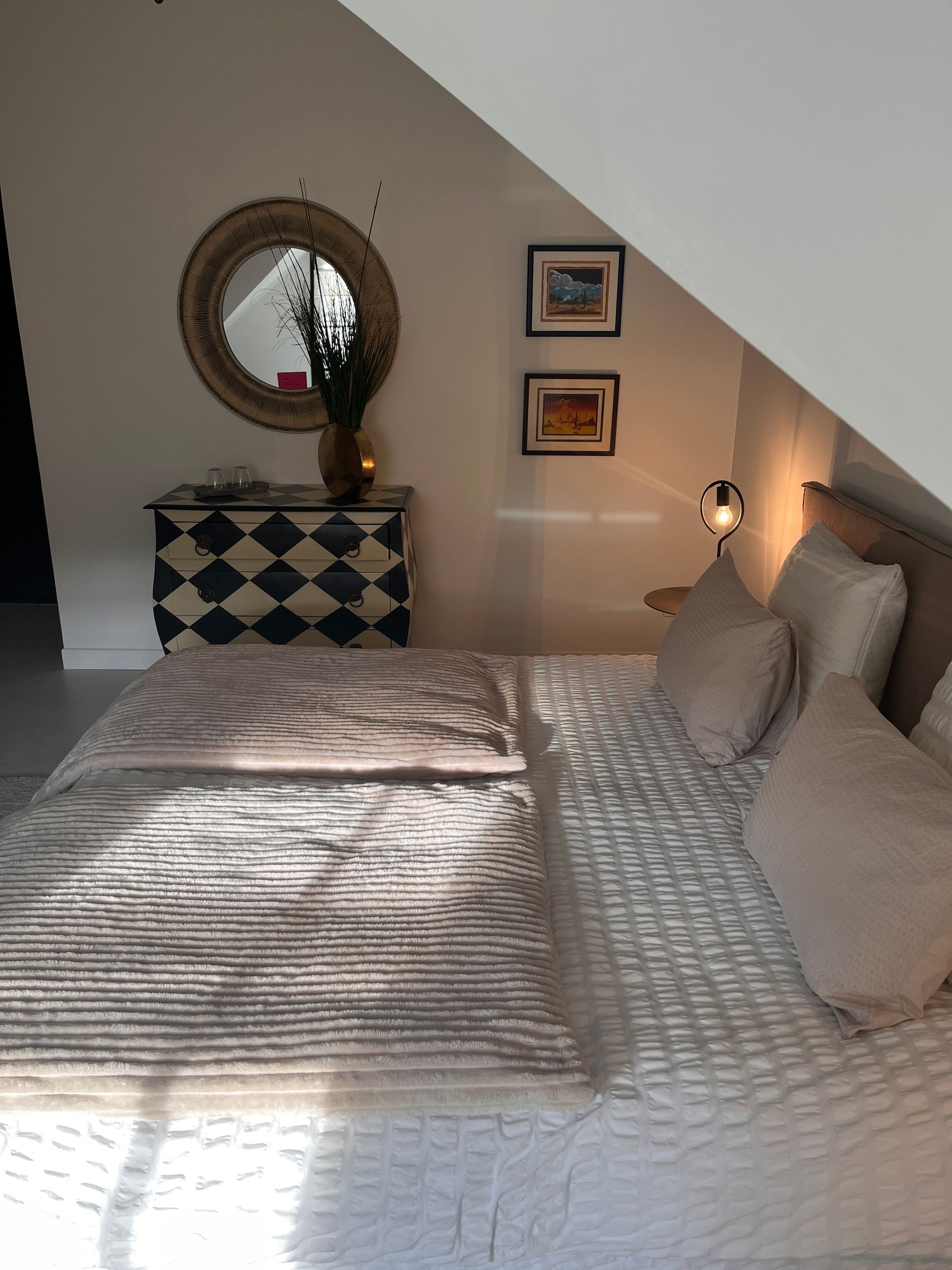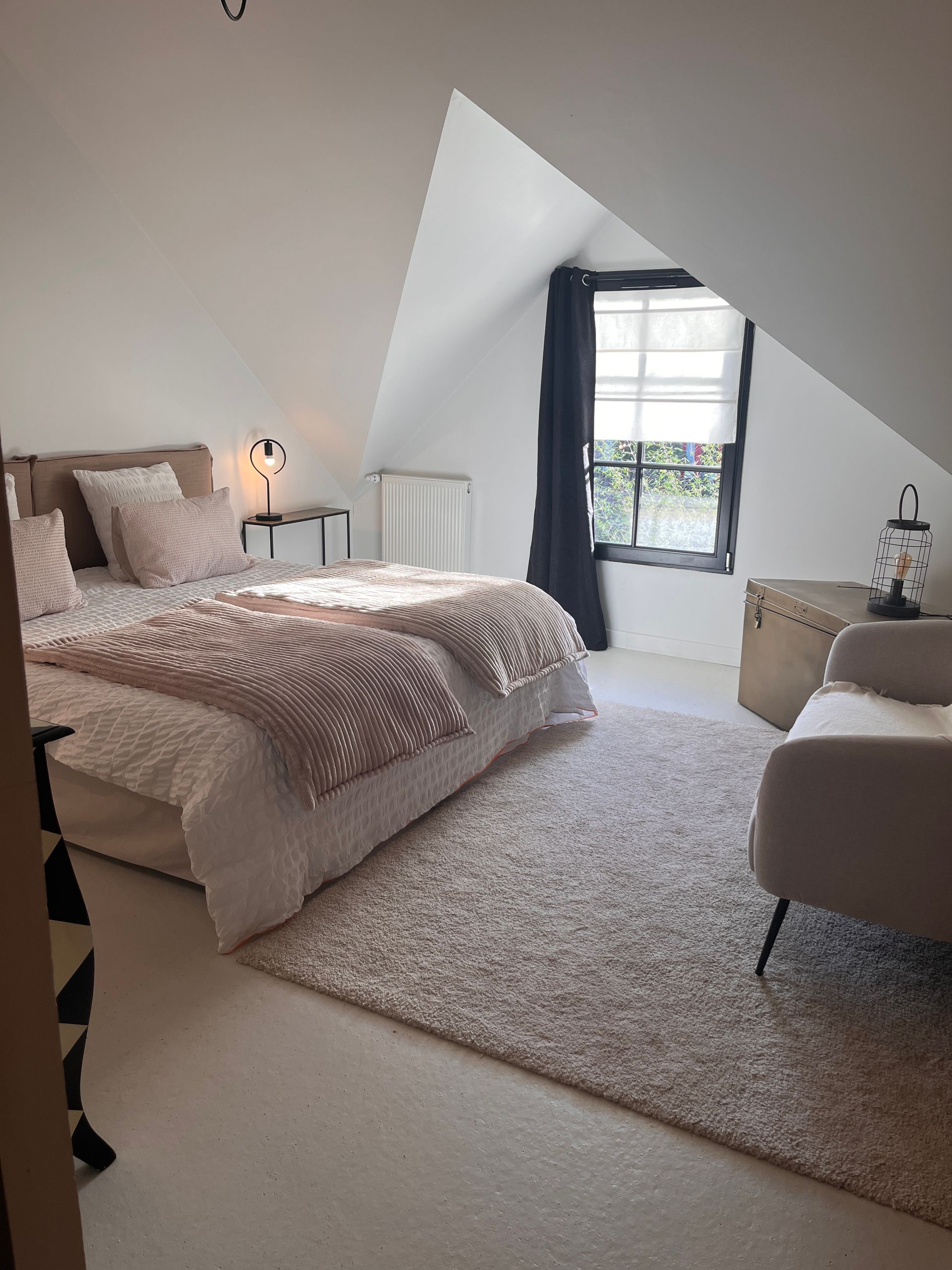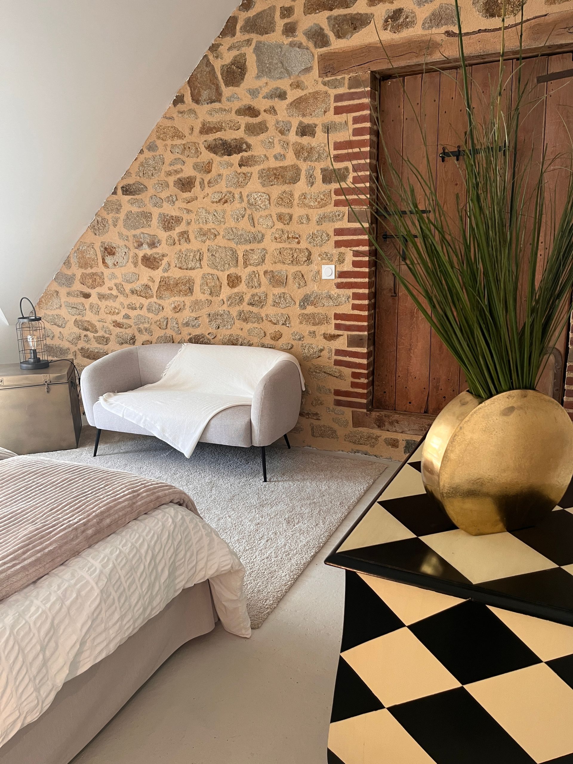Chambre avec belle hauteur sous faîtage, très spacieuse et confortable avec son mobilier alliant ancien et contemporain La chambre Albane est équipée d'1 lit king size avec literie super confort.